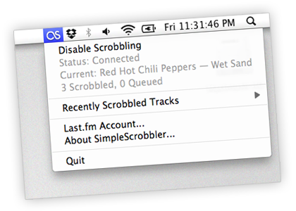 SimpleScrobbler is a Last.fm scrobbler without all the bells and whistles. A Mac App that lives in your status bar and leaves a smaller footprint on your computer.
